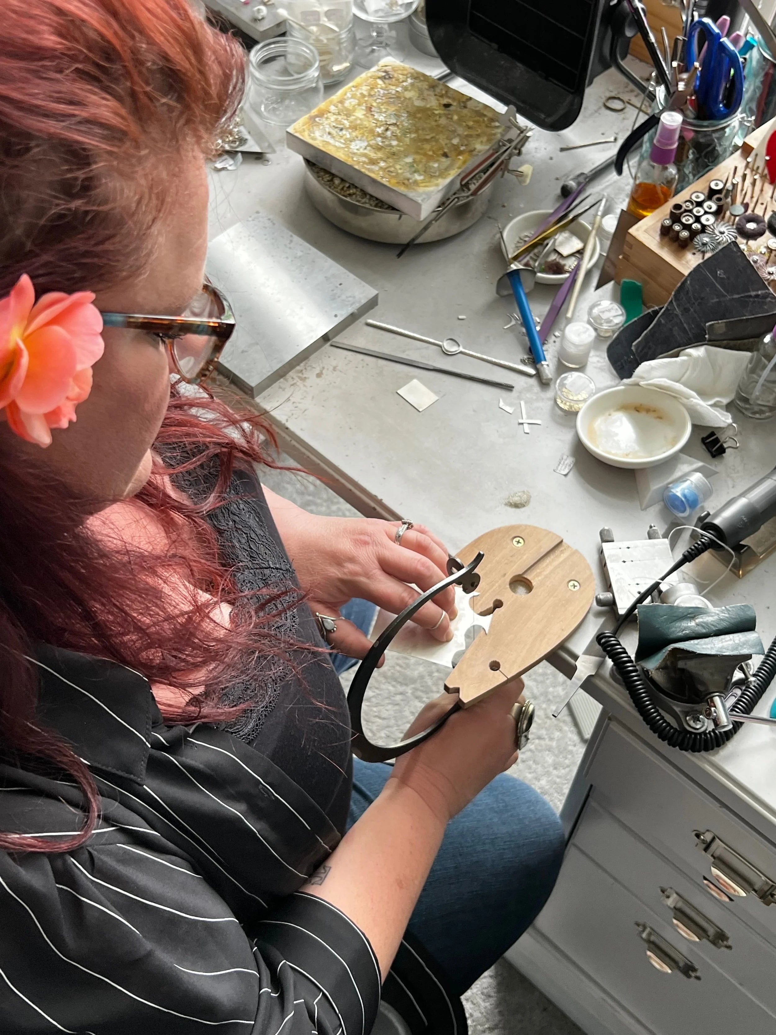 Two years ago she was laid off and finally took the plunge; she started working with fire. She spent day and night in her studio teaching herself to solder. If she wasn’t at her computer with a giant mug of coffee and toothpicks holding her eyes open, researching tools and watching videos, she was at her bench with a torch in hand. It was during this time that the pandemic swept the country and she could not take any classes in person. It was challenging as she had no idea if the direction she was taking was the “right” one. She felt like she was not good enough, most of the time.